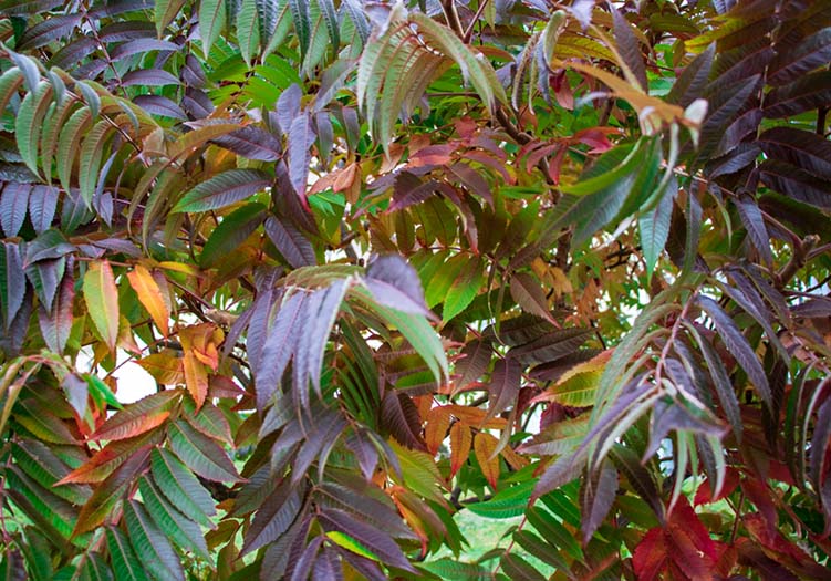 Die Blätter des Essigbaums sind groß, gefiedert und grün. Sie wechseln im Herbst ihre Farbe zu leuchtend orange bis scharlachrot.