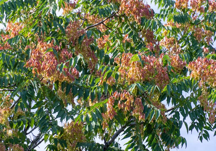 Der Götterbaum (Ailanthus altissima) ist ein laubabwerfender Baum und gehört zur Familie der Simaroubengewächse. Er stammt ursprünglich aus China und wurde im 18. Jahrhundert als Zierpflanze in Europa eingeführt. Seitdem hat er sich in vielen Teilen der Welt verbreitet. Götterbäume sind in der Lage, auch in schlechten Bodenbedingungen zu wachsen und werden daher oft als Unkraut bezeichnet. Sie können bis zu 30 m hoch werden und haben eine breite, ausladende Krone.