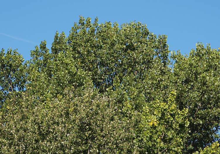 Die Blätter der Pappel sind herzförmig bis eiförmig und wechselständig angeordnet. Sie sind auf der Oberseite grün und glänzend und auf der Unterseite silbrig behaart. Im Herbst färben sie sich gelb bis rötlich. Pappeln blühen im Frühling, wobei die männlichen und weiblichen Blüten an unterschiedlichen Bäumen wachsen. Die männlichen Blüten bilden lange, grüne Kätzchen. Die weiblichen Blüten sind kleiner und ebenfalls in Kätzchen angeordnet. Nach der Blüte bilden sich die Früchte der Pappel, die sogenannten Pappelflaumkätzchen. Sie sind rundliche, samenreiche Kapseln, die an langen Stielen hängen und im Herbst abfallen.